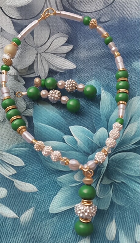 The Green & Silver Earring and Bracelet Set features a stylish combination of vibrant green and crisp white elements, perfect for enhancing any space.
